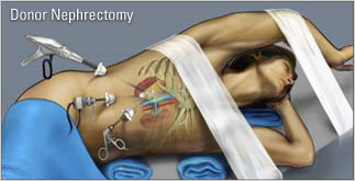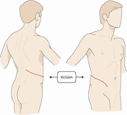 Anda tahu bagaimana para dokter melakukan operasi Ginjal? Gambar berikut ini akan memperlihatkan berapa besar luka yang dibuat oleh dokter dalam operasi ginjal. Luka itu memanjang dari punggung bawah ke perut, kurang lebih 2 jengkal (garis merah).