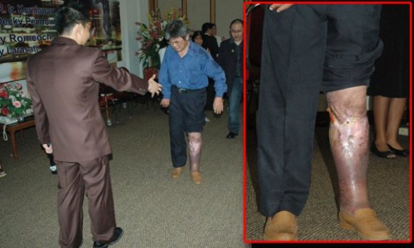 Orang kedua namanya Leman, umurnya 55 tahun. Dia menderita Stroke. Apakah dia sembuh? Tentu saja tidak. Perhatikan langkah kakinya. Perhatikan gerakan tangannya. mohon maaf, tanpa mengurangi rasa hormat, hanya orang-orang TOLOL yang menyatakan bahwa Pak Leman sudah sembuh dari Strokenya dan hanya orang-orang idiot yang percaya bahwa itulah yang disebut MUJIZAT orang lumpuh berjalan.
