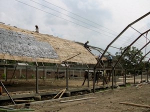 Daging atap dibentuk dari krepyak (bambu yang diremukkan). Di atasnya kantong-kantong semen yang dipoles aspal atau karpet talang sisa proyek, di atasnya lagi, ijuk. Kantong semen terbuat dari kertas dan kertas akan lumer oleh air. Kantong semen yang tidak dilumuri aspal dengan baik akan bocor. Air mengalir ke tempat yang lebih rendah. Kantong semen dan karpet talang memiliki ketebalan  yang berbeda. Polesan aspal yang tidak merata pada kantong semen akan menyebabkan ketebalan yang tidak sama. Bambu-bambu remuk pun memiliki ketebalan yang tidak merata. Permukaan yang tidak rata menyebabkan air menggenang di tempat yang rendah. Genangan air akan mencari celah. Ketika genangan air hujan menemukan celah maka itulah yang disebut bocor. Ijuk memang menahan air hujan namun celahnya besar dan air selalu mengalir ke tempat yang lebih rendah. Kemiringan atap Rempah Rumah Karya ditentukan oleh tulang-belulangnya. Kerapihan atap Rempah Rumah Karya ditentukan oleh para tukangnya. Material sudah berbicara dan sang arsitek sudah berkata-kata, selanjutnya para tukanglah yang menjadi Tuhannya sementara matahari adalah  iblisnya. Bila terjadi kebocoran, siapa yang harus disalahkan? Menyalahkan bahkan menghukum memang mendatangkan kepuasan namun sama sekali tidak mencegah kebocoran. Itu sebabnya yang dilakukan adalah mencari cara untuk mengatasi kebocoran. Dengan cara demikianlah semua yang terlibat menarik pelajaran.