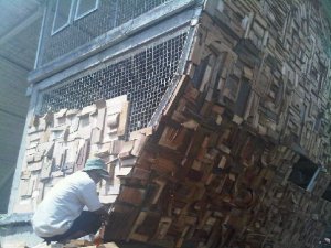 Limbah kayu menjadi daging untuk dinding. Potongan kayu dijahit dengan kawat agar melekat pada kasa harmonika yang adalah urat dan saraf Rempah Rumah Karya.