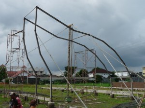 Rak penyimpanan barang di lantai dasar, lantai satu dan lantai dua yang dibuat dari pipa adalah bagian dari struktur yang selain menopang dirinya sendiri, menopang lantai juga menopang seluruh bangunan. Yang anda lihat dalam foto adalah rak-rak di lantai satu bangunan Rempah satu yang nantinya kemungkinan besar akan dinamai Rempah Kre+O karena lantai dasarnya akan menjadi Creative Outlet alias toko kreatif. Sang arsitek benar-benar pelit karena tidak ada satu elemen pun yang dibiarkannya nganggur. Sang arsitek benar-benar murah hati karena setiap elemen dicarikan cara untuk berguna.
