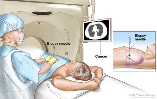4. Aspirasi Jarum halus (Fine-needle aspiration): Mengambil kelenjar getah bening dan atau jaringan dalam paru-paru menggunakan jarum halus yang ditusukan lewat dada.